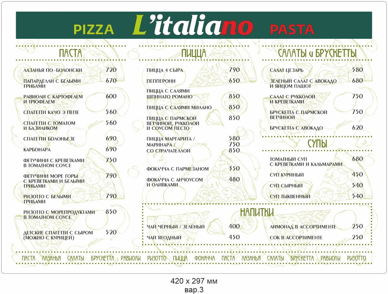 «Litaliano»— это идеальное место для любителей итальянской кухни. Здесь вы найдёте широкий выбор блюд, включая пиццу, пасту, ризотто и десерты. В меню представлены как классические, так и авторские блюда.